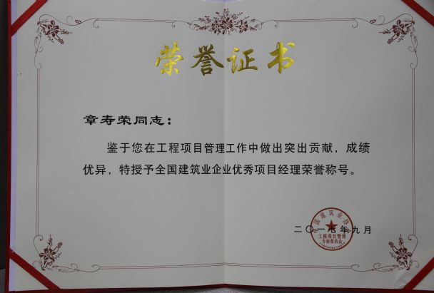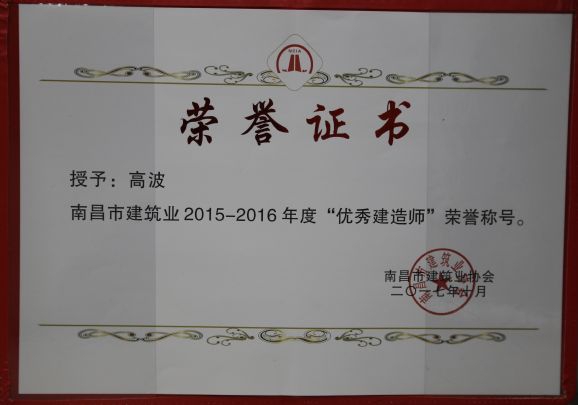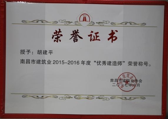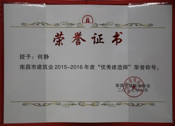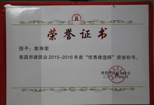 南昌市建筑業協會對公司頒發了南昌市建筑業2015-2016年度“先進企業”榮譽稱號,對公司建造師章壽榮、何靜、胡建平、高波頒發了南昌市建筑業2015-2016年度“優秀建造師”榮譽稱號;中國建筑業協會對章壽榮頒發了全國建筑業企業優秀項目經理榮譽稱號。